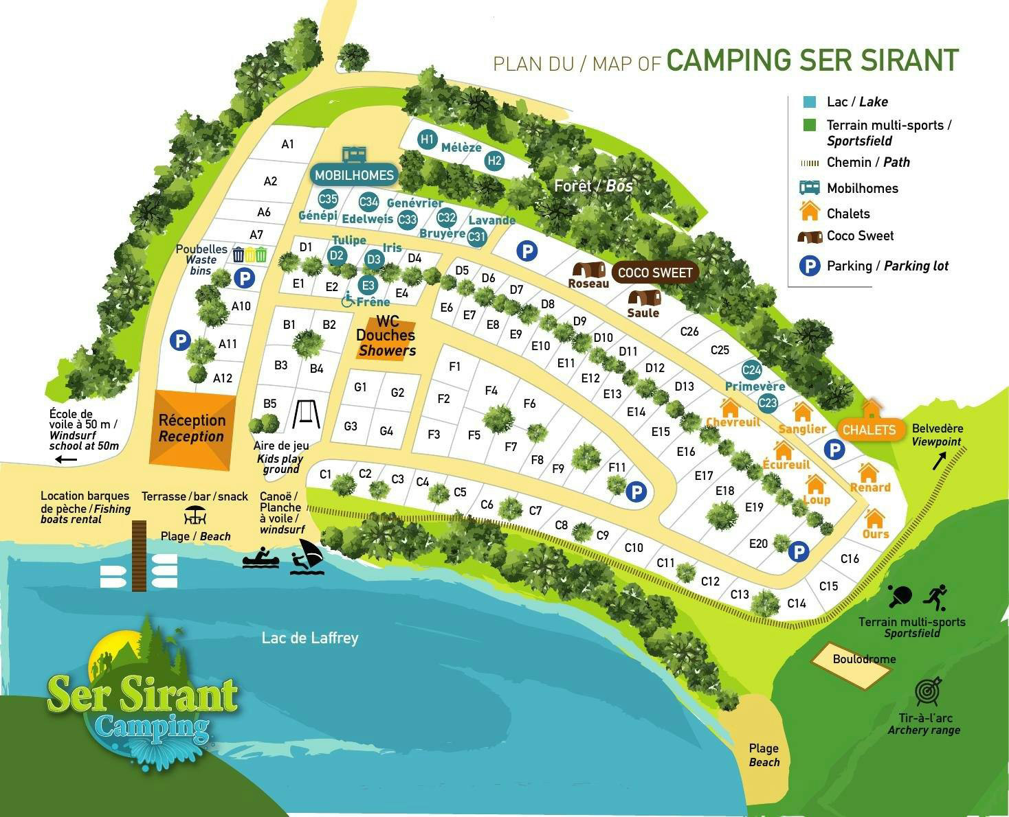 De kampeerplaatsen op Camping Ser-Sirant liggen verspreid over een groen en licht hellend terrein dat direct aan het meer grenst. Door de terrassen opzet hebben staanplaatsen een prachtig uitzicht over het water. Liever wat meer onder de bomen kamperen of de nodige schaduw? Kan ook! De plekken zijn geschikt voor tenten, caravans en campers. Ook voor wie op doorreis is zijn er plekken beschikbaar. Voor wie liever wat meer comfort heeft, zijn er ook verschillende huuraccommodaties beschikbaar, zoals stacaravans en chalets. Vanaf je eigen terras voor je accommodatie heb je ook weer dat prachtige uitzicht die echt nooit verveeld. Een leuke aanwezige glamping accommodatie zijn de coco sweet tenten.