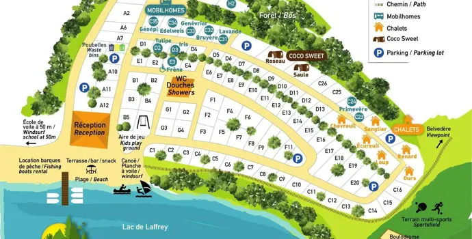 Zodra je aankomt kun je je eerst melden bij de receptie die gesitueerd is in een houten blokhut. Past helemaal in de omgeving! Er is een klein strandje aan het meer waar je kunt zwemmen of ontspannen aan het water, terwijl watersportliefhebbers hier ook kunnen zeilen, suppen of kajakken. Kano en surfplanken huur je eenvoudig op de camping zelf. Voor kinderen zijn er speeltoestellen en voldoende ruimte om te spelen op de camping. Daarnaast beschikt de camping over een restaurant en bar met terras, waar je kunt genieten van een maaltijd of een drankje met uitzicht op het meer. Ook is er een kleine winkel voor basisboodschappen en vers brood in de ochtend. In het hoogseizoen strijkt een Nederlandstalig animatieteam neer op de camping. En aangezien de camping graag bezocht wordt door Nederlandse gezinnen met wat oudere kinderen worden deze ook echt niet vergeten!