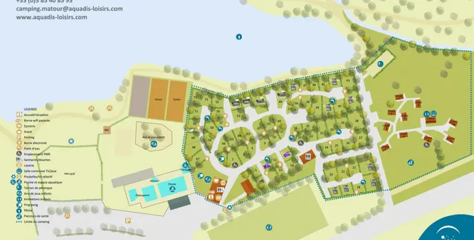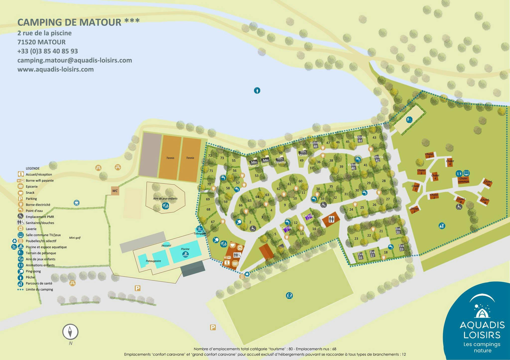 Camping de Matour ligt in het hart van de Bourgogne, in een rustig dal aan de rand van het dorp Matour. De camping grenst aan een recreatiemeer en wordt omringd door zacht glooiende heuvels, bossen en weides. Op de camping zelf een leuke mix van rustzoekers, natuurliefhebbers en gezinnen. De camping is kleinschalig, persoonlijk en met genoeg voorzieningen voor een fijne kampeervakantie.