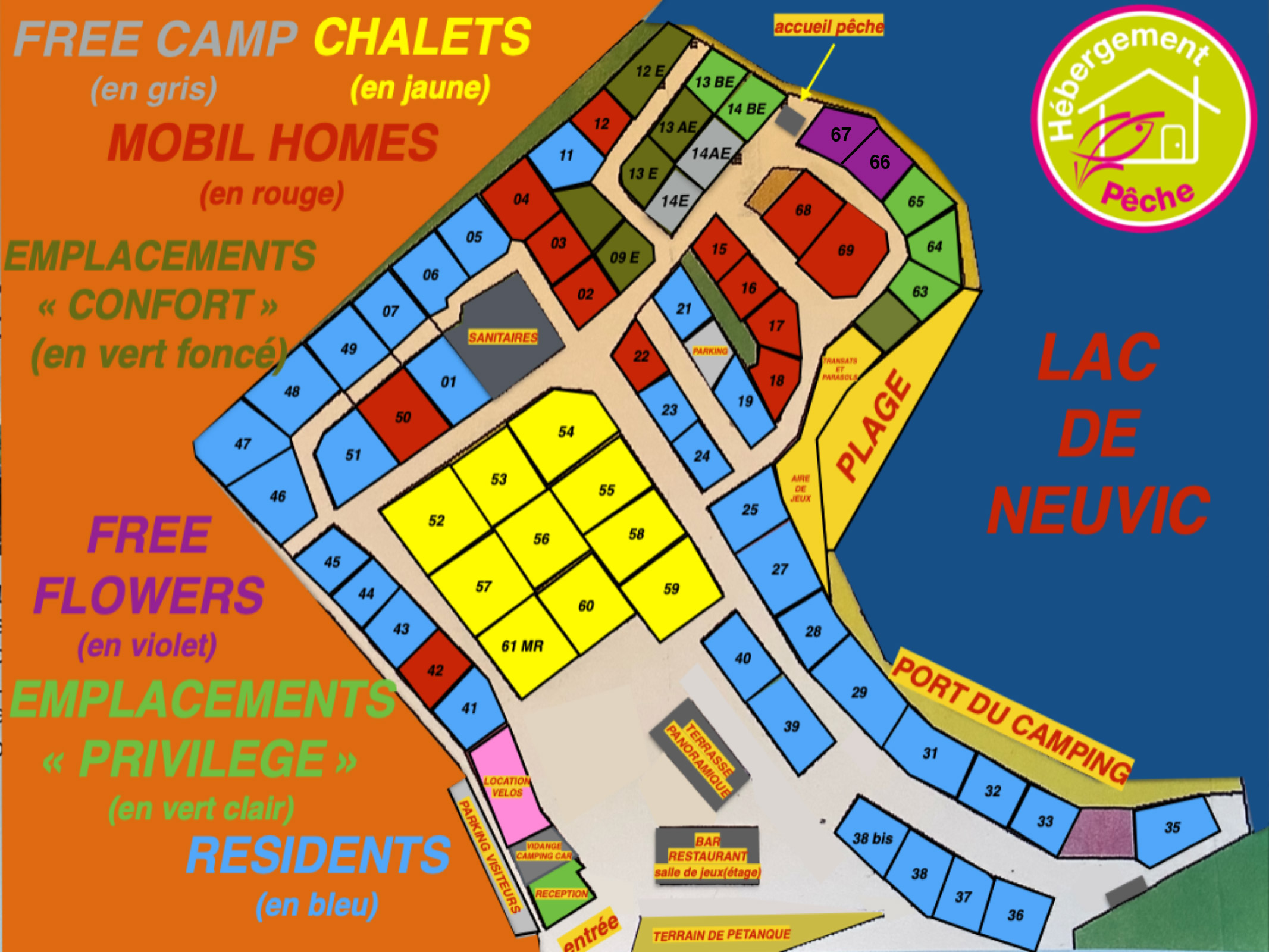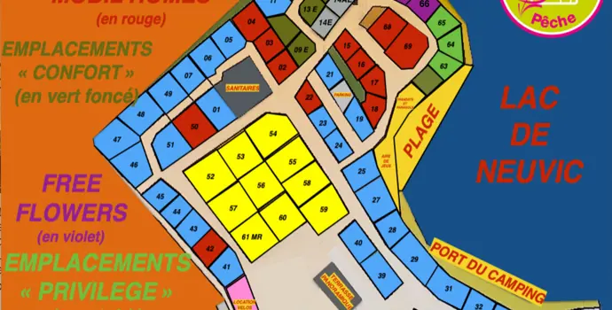 De kampeerplaatsen op Camping Le Port de Neuvic liggen verspreid over een licht glooiend terrein, deels beplant met bomen die voor natuurlijke schaduw zorgen. Veel plekken bevinden zich direct aan het water, wat zorgt voor een bijzonder uitzicht en een unieke kampeerervaring. Zeker voor wie hier komt vissen aan het meer zijn deze plekken erg geliefd. Voor wie liever wat meer comfort heeft zijn er premium plekken met privé sanitair. Ook zijn er een aantal huuraccommodaties beschikbaar. Ga je voor een bungalowtent of liever een chalet? Welke je ook kiest ze zijn volledig uitgerust en beschikken over een eigen terras waardoor je optimaal kunt genieten van het buitenleven.