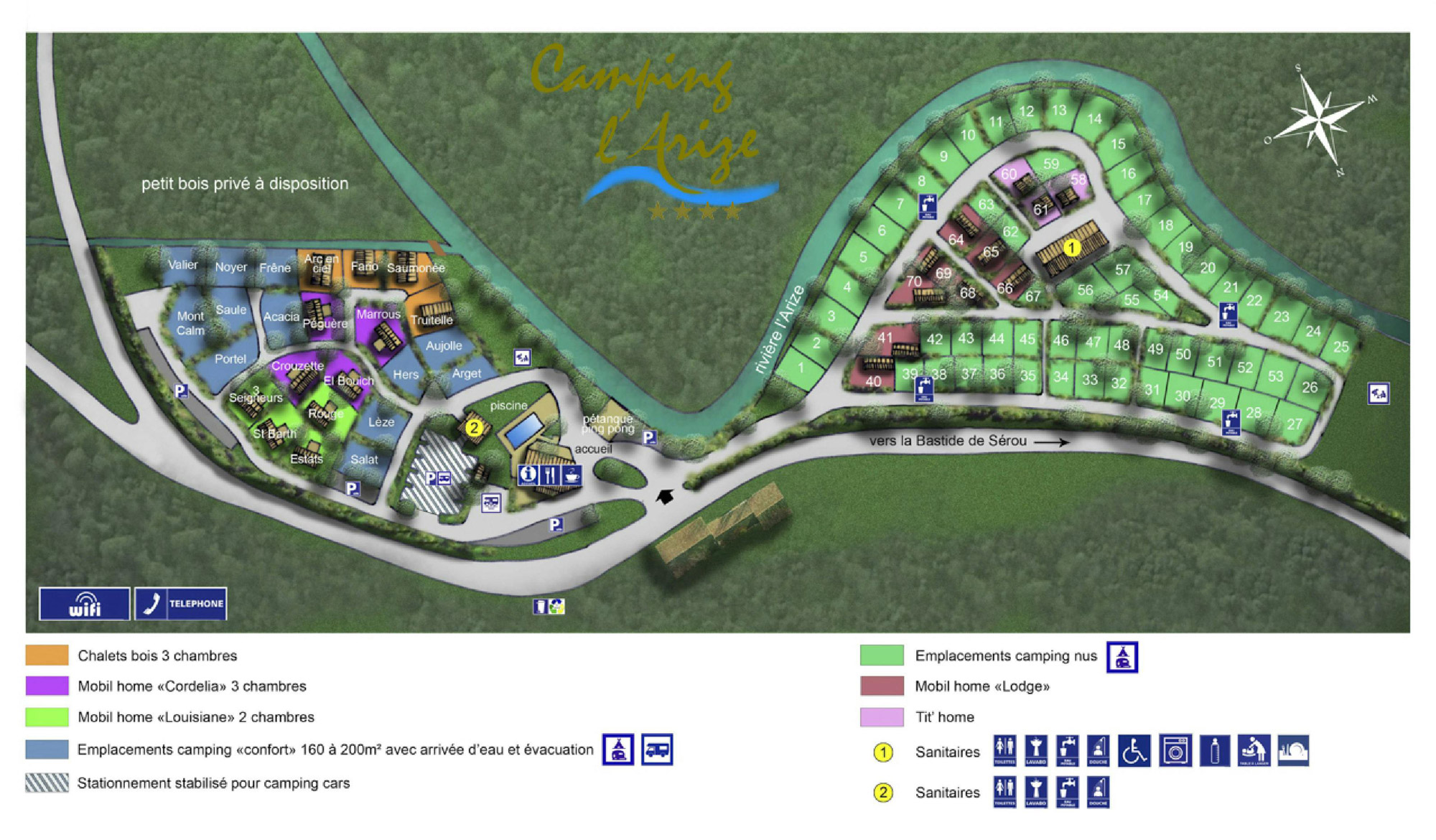 De rivier de Arize stroomt langs de camping. Je kunt er niet echt in zwemmen want te ondiep maar dit maakt het extra leuk voor de kinderen. Spelen in de rivier, pootjebaden of vissen. En dan is er ook nog het verwarmde zwembad met apart kinderbadje op de camping te vinden. Waterpret genoeg dus. Daarnaast vinden de kinderen tot 12 jaar de kinderclub altijd heel erg leuk. Hier ontmoeten ze leeftijdsgenootjes en wordt er volop geknutseld en gesport. Ook de andere gasten worden niet vergeten; de gezellige thema-avonden en sporttoernooien worden altijd gewaardeerd. Voor een hapje en een drankje zijn er de bar, de broodjesservice en een kleine campingwinkel aanwezig.