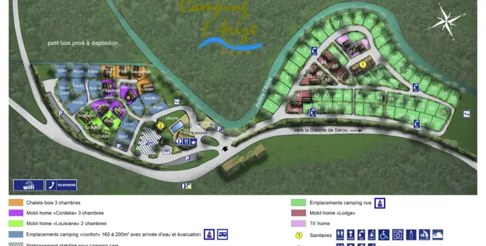 Het zal je niet verbazen dat op deze groene camping je ook kampeerplaatsen in het groen vindt. Beschutte kampeerplaatsen met voldoende privacy en het nodige aan schaduw. Aangezien de staanplaatsen nogal variëren in grootte mede door het landschap is het handig vooraf de afmetingen van je kampeermiddel door te geven. Kom je met een camper dan zijn er een aantal aparte plekken voor je beschikbaar. Met zo'n zeventig staanplaatsen met diverse huuraccommodaties blijft de camping overzichtelijk en kleinschalig. Dus naast kamperen kun je hier ook ingerichte tenten en chalets huren. De camping wordt graag bezocht door Nederlandse jonge gezinnen maar ook door Franse gezinnen. Samen met de sportieve vakantieganger en de natuurliefhebber vormt dit een leuke mix.