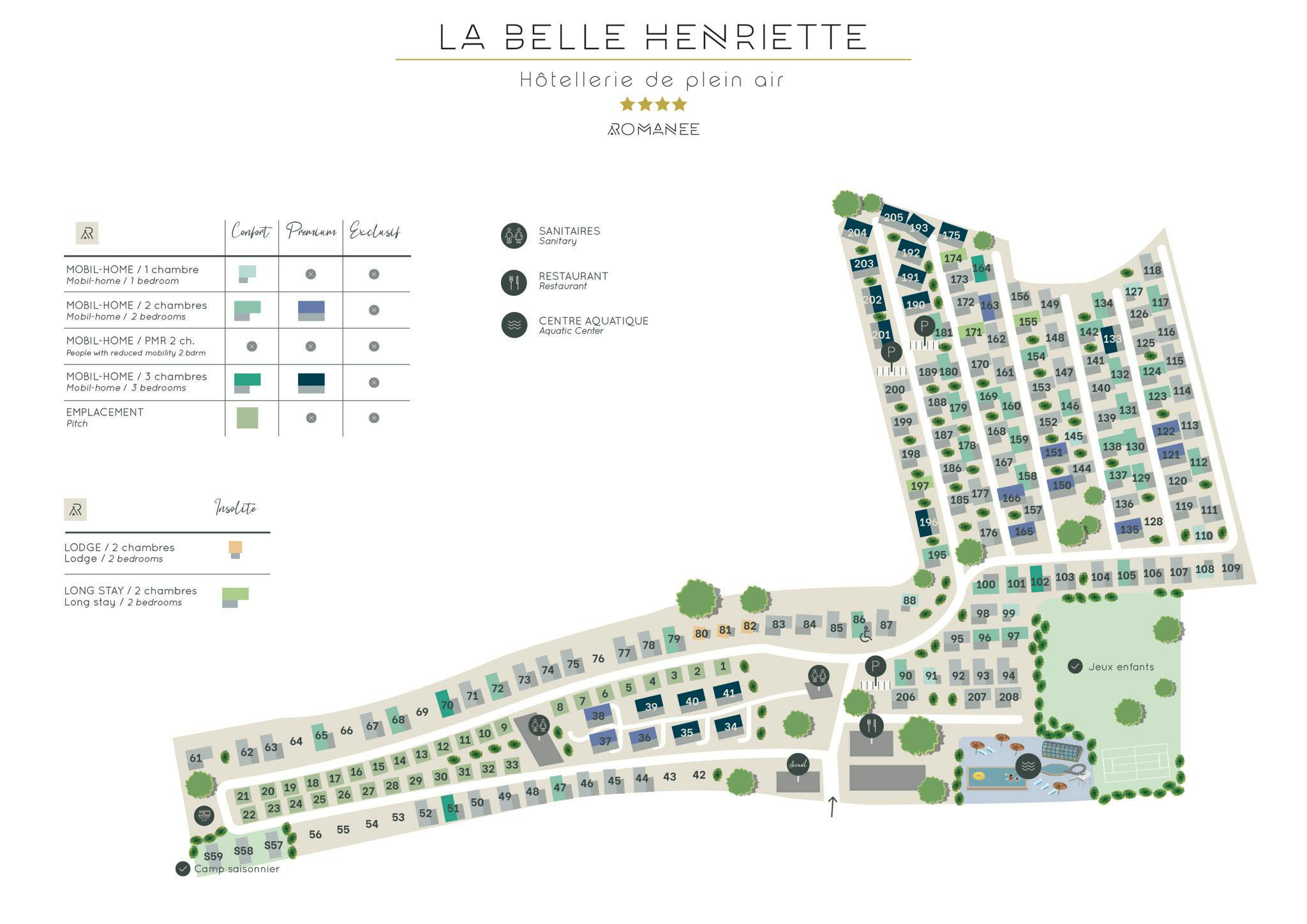 Het waterpark bestaat uit meerdere verwarmde baden, waaronder een binnenzwembad met peuterbad, bubbelbaden en een groot buitenbad met glijbaan. Er zijn sport- en speelfaciliteiten zoals een Multi sportveld, speelplein, petanquebanen en tafeltennistafels. Voor eten en drinken kun je terecht bij het restaurant/snackbar/bar, neem hier plaats voor een lekker diner of kies voor een afhaalmaaltijd. Er zijn gemeenschappelijke BBQ´s te vinden op de camping. Camping La Belle Henriette biedt daarnaast activiteiten en entertainment in het hoogseizoen animatie voor kinderen maar ook yoga of aqua gym. In de avond is er vaak animatie voor het hele gezin.