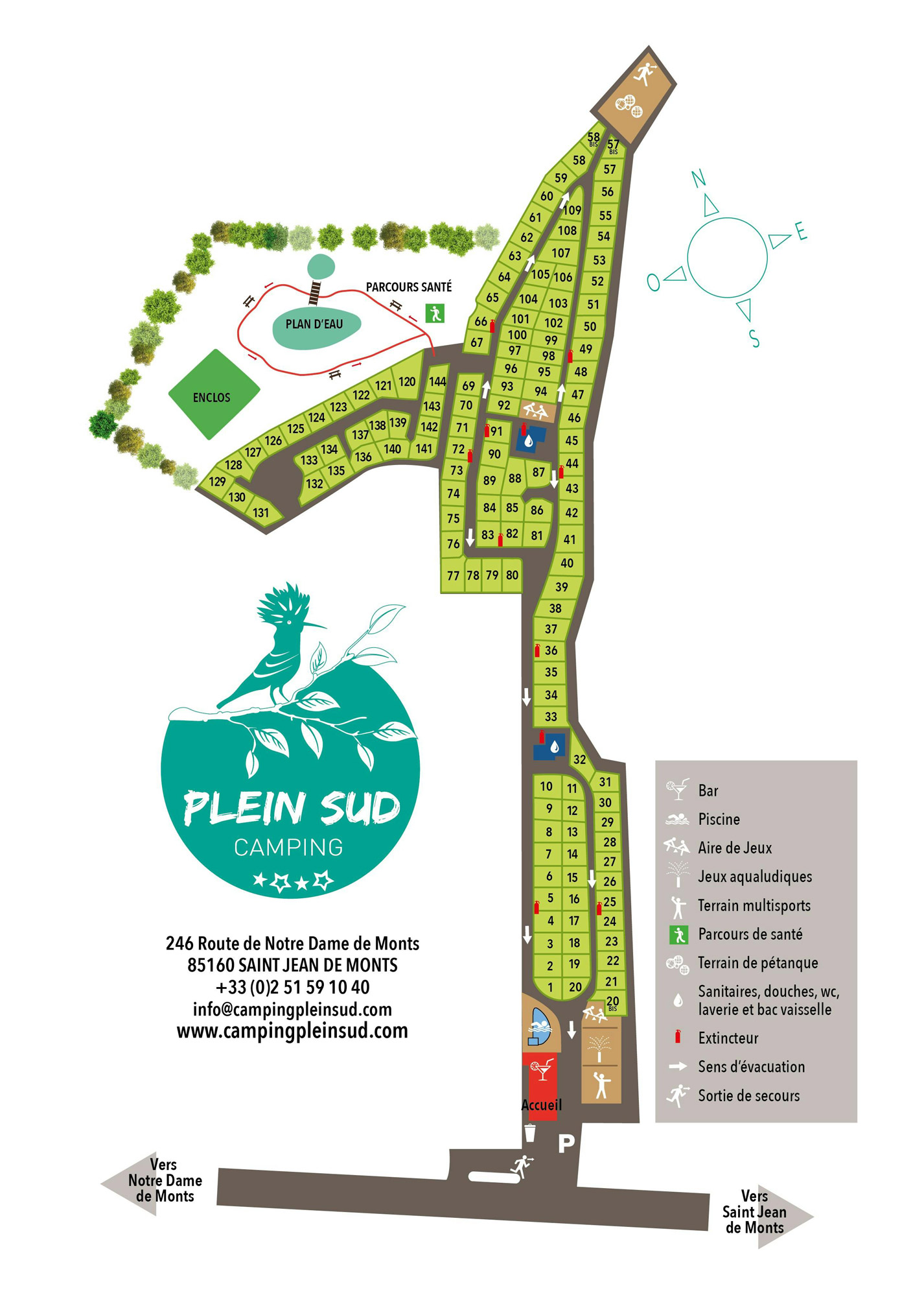 Camping Plein Sud is een rustige, kleine, goed onderhouden viersterrencamping. Langgerekt en smal aan de weg tussen Notre Dame-de-Monts en Saint Jean-de-Monts. Er zijn ruime kampeerplaatsen afgescheiden door bomen en heggen voor je tent, caravan of camper. Ook voor kampeerders die liever een accommodatie huren heeft Plein Sud plek. Kies zelf je favoriet. Ga je voor een trekkershut, lodgetent of een chalets. Van die laatste heb je meerdere uitvoeringen. Ze beschikken allemaal over een fijn terras om te genieten van de buitenlucht. In de luxere uitvoering zit ook een airco en vaatwasser.
