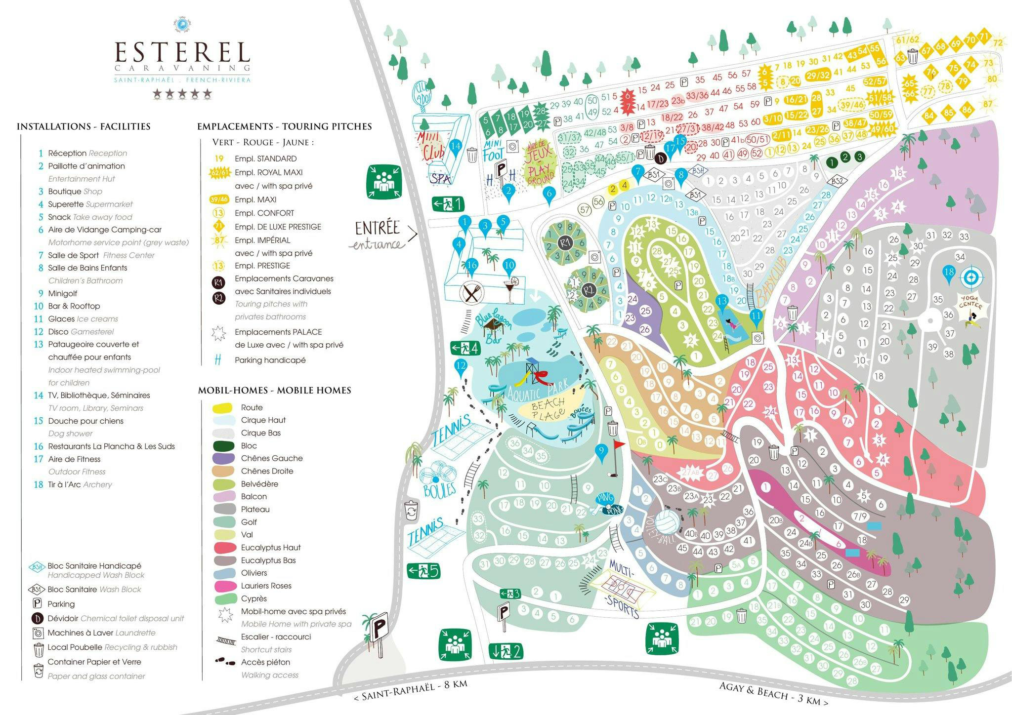 Esterel Caravaning biedt ruime staanplaatsen voor caravans en campers, allemaal voorzien van elektriciteit, watertoevoer en riolering, met oppervlaktes tot wel 250 m². Mooie afgebakende plekken omzoomd door heggen voor de nodige privacy. Voor wie liever huurt: de camping heeft een breed scala aan stacaravans (mobile homes) voor 2 tot 8 personen, met moderne voorzieningen zoals keukens, airconditioning, tv en wifi. Voor de extra luxe-kampeerders zijn er zelfs privé-spa’s, terrassen, en in sommige accommodaties een eigen zwembad of spa-faciliteiten. Wat fijn dat hier ook grotere gezinnen of gezelschappen terecht kunnen.