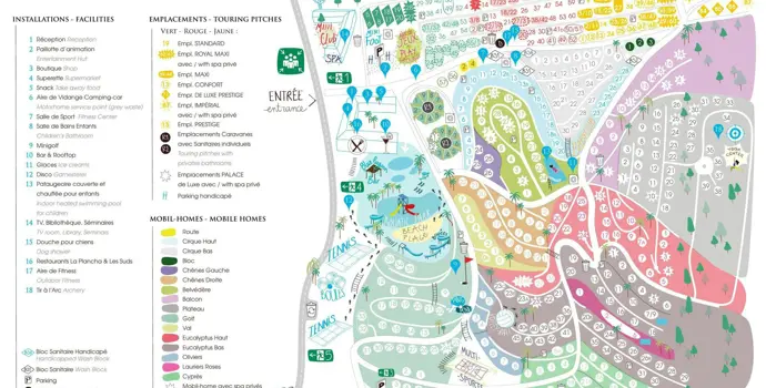 De voorzieningen op de camping zijn talrijk te noemen. Je hebt toegang tot een groot waterpark met meerdere zwembaden, vijf glijbanen waaronder snelle banen en een strand met wit zand en palmbomen. Voor de kinderen zijn er miniclub, babyclub, tienerclub en aparte peuterbaden, zodat iedereen zich zal vermaken. Verder zijn er sportfaciliteiten (tennis, multisportvelden, fitness, minigolf, beachvolleybal), wellness- en beauty-centrum voor wie wil ontspannen, en voldoende eetgelegenheden: restaurants, snackbar, minimarkt, bakkerij en bar, zodat alles op het park aanwezig is voor het nodige kampeergemak.