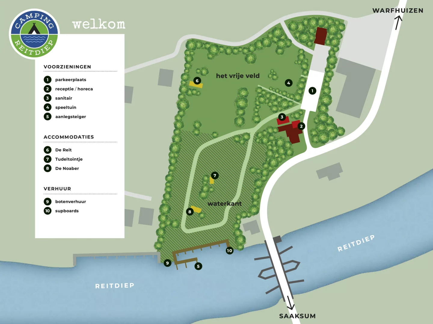 In het weidse Groninger landschap aan het water van het Reitdiep ligt de kleinschalige camping Reitdiep. Kampeer je met een tent? Kies dan zelf een plaatsje uit op het 'vrije veld'. Uiteraard zijn caravans en kleine campers ook van harte welkom. Er zijn plaatsen in de luwte van de bomen of juist aan het water. Gasten ontmoeten elkaar aan de gezamenlijke picknicktafels, bij de vuurplaats of in de ontmoetingsruimte 't Klokje. Je kunt er genieten van een vers kopje koffie, boeken en spelletjes. Af en toe is er livemuziek en kun je je inschrijven voor een vers bereide gezamenlijke avondmaaltijd. Voor de kinderen is het fijn dat het terrein autoluw is. Ze vermaken zich prima in de speeltuin, bij de trampoline of de tafeltennistafel. De ligging aan het water is ook goed voor uren speelplezier. De camping verhuurt diverse bootjes en supplanken. Bij de aanlegsteiger zijn wat plaatsen beschikbaar voor je eigen meegebrachte bootje. Met de trap aan de steiger kun je afdalen om lekker te gaan zwemmen in het heldere water.