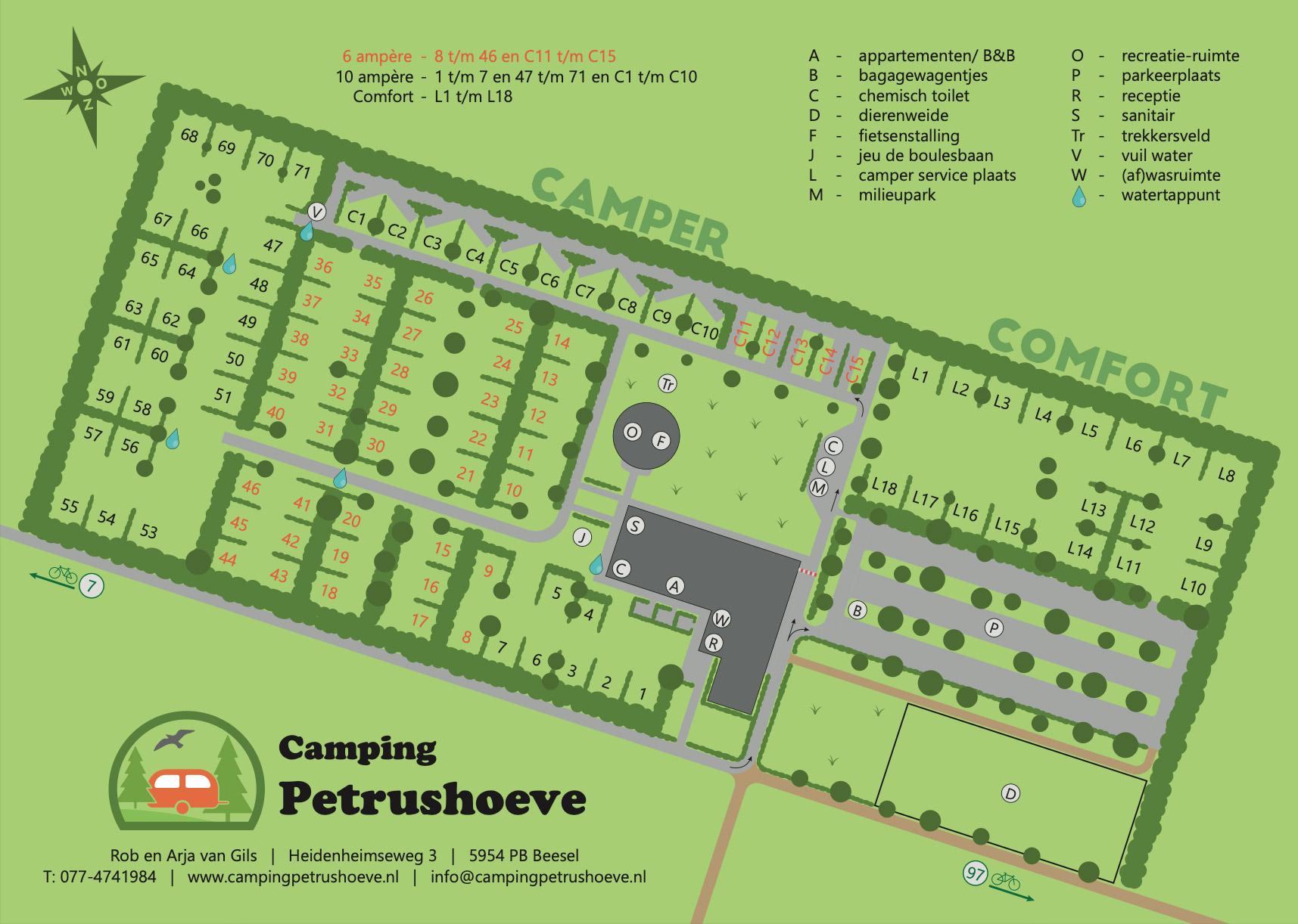 Je vindt de camping in een bosrijke omgeving op de grens van Noord met Midden-Limburg tussen de steden Roermond en Venlo. De kampeerplaatsen op de camping zijn groot te noemen. Kies je plekje uit op een van de velden waar de kampeerplaatsen gescheiden zijn door lage haagjes. Er zijn aparte plaatsen voor campers en een apart trekkersveld. Om het landelijke karakter en de rust te behouden is de camping autovrij en ook huisdiervrij. Er zijn geen seizoens- of jaarplaatsen beschikbaar. Het sanitair op de camping is goed verzorgd en bij de afwasruimte vind je tevens een wasmachine en droger. Bij de receptie bevindt zich een bibliotheek, toeristische informatie, fietsverhuur, zijn er wat 'vergeten' boodschappen en een lekker ijsje verkrijgbaar. In de nabijgelegen plaatsen Reuver en Swalmen zijn diverse supermarkten te vinden. De camping beschikt niet over een eigen zwembad maar op korte afstand vind je een strandbad, een subtropisch zwemparadijs en twee openluchtbeden. Overnachten kan ook zonder eigen kampeermiddel in een van de appartementen of bed & breakfast. Ideaal als je gasten op de camping ontvangt die willen blijven slapen of als je zelf het Pieterpad loopt.