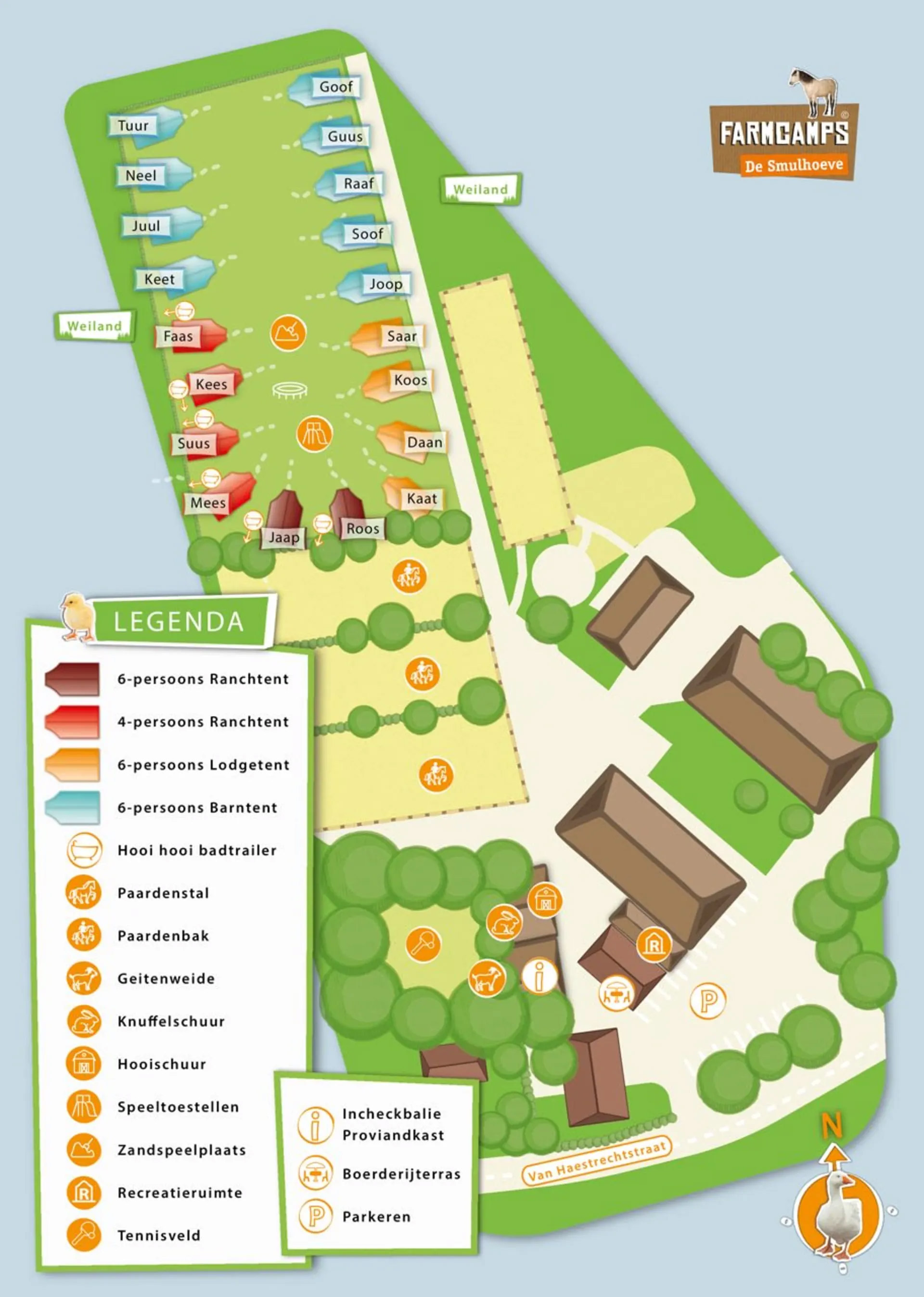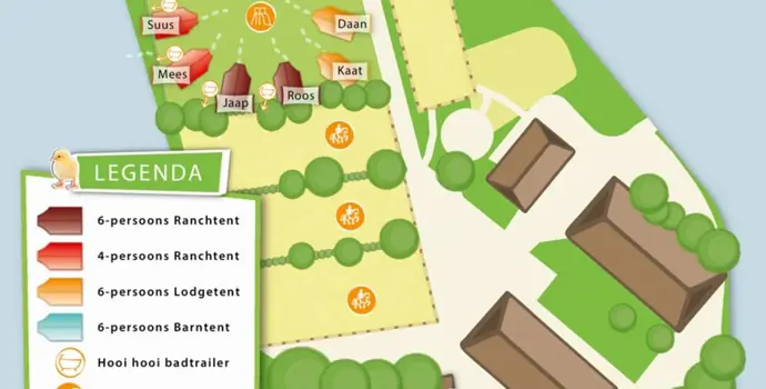 Op De Smulhoeve verblijf je niet met je eigen kampeermiddel, maar in één van de 19 sfeervolle glampingaccommodaties die op het erf staan. Er zijn luxe safaritenten, lodgetenten en Ranchtenten, allemaal met een eigen keuken, eethoek en comfortabele bedden. Sommige tenten beschikken ook over een privébadkamer met douche en toilet. De accommodaties staan op ruime grasvelden, met uitzicht over de weilanden en de paardenstallen. Hier kun je ’s ochtends wakker worden met het geluid van het hinnikende de paarden. En oh ja de koeien van de buurman.