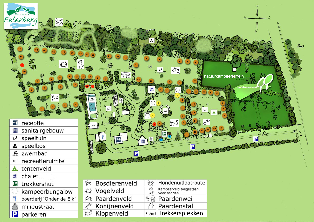De 66 kampeerplaatsen op natuurcamping Eelerberg zijn heel divers maar liggen allemaal in het groen. Het terrein heeft namelijk veel natuurlijke beplanting en prachtige bomen. Centraal op de camping ligt de authentieke boerderij 'onder de eik' voor een hapje, drankje, spelletje en gratis wifi. Voor verse broodjes, wat vergeten boodschappen of simpelweg een praatje kun je terecht bij de receptie. Hier liggen ook leuke kinderwandel- en fietsroutes en zelfs een hondenuitlaat route. Fietsen huur je trouwens eenvoudig op de camping zelf. Als je de kinderen tenminste mee krijgt want die zullen zich prima vermaken in de zandkuil, in het speelbos, bij de waterfonteinen of bij de diverse dieren op de camping. Ook worden er regelmatig leuke activiteiten georganiseerd zoals broodjes en pizza's bakken. Heb je geen eigen kampeermiddel huur dan een van de chalets of kampeerbungalows en kom genieten van alle rust, ruimte en natuur op deze charmecamping.