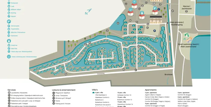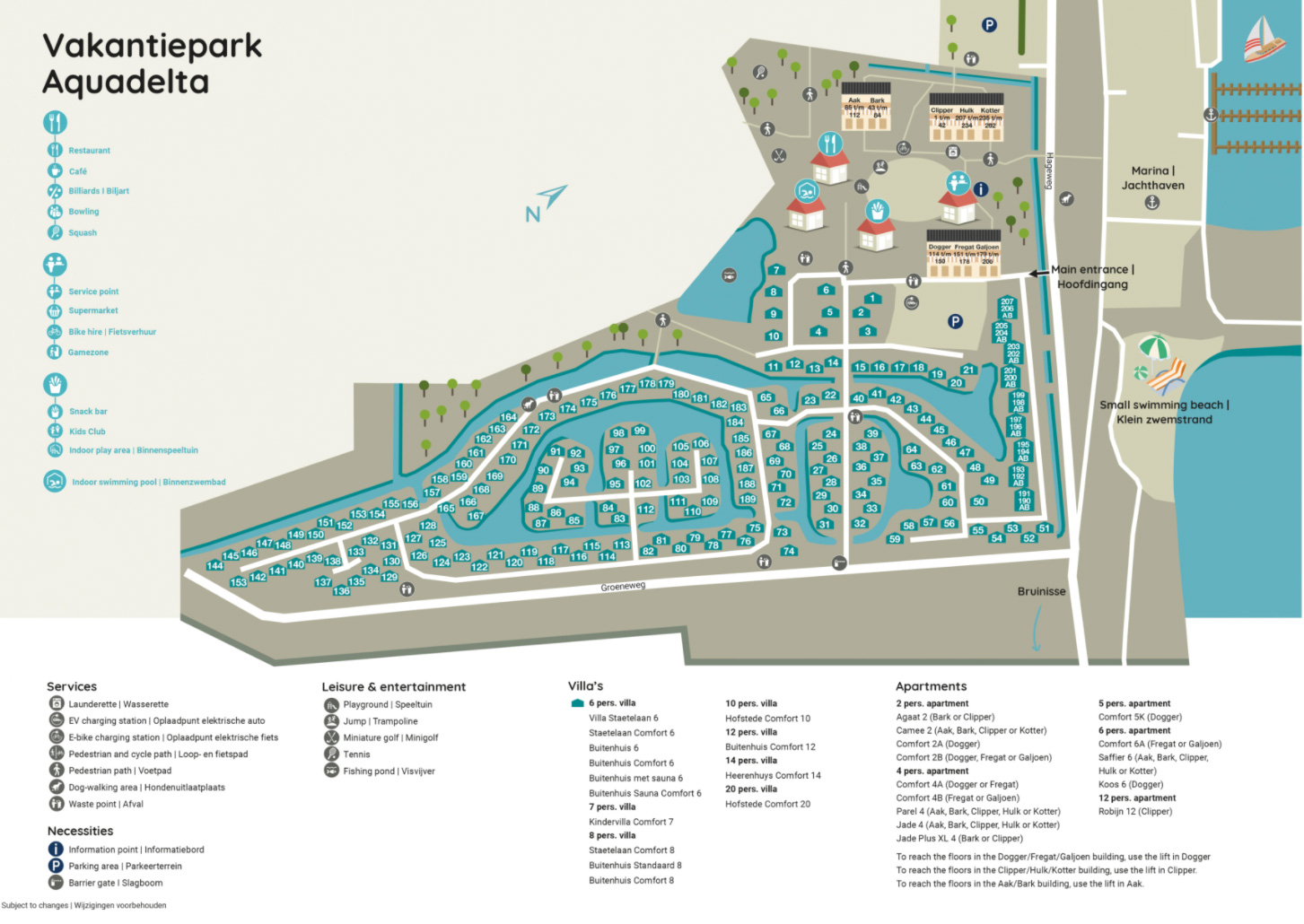 Eenmaal aangekomen op het park zul je merken dat de meeste faciliteiten zich aan het begin van het vakantiepark bevinden en gelegen zijn rondom een gezellig plein. Zet je spullen in je vakantiehuisje en ontdek het park. Het overdekte zwembad, de midgetgolfbaan, de kadoshop en supermarkt. Je bent er echt even helemaal tussenuit. De sportfaciliteiten beperken zich niet alleen tot de watersport op het park zelf kun je ook tennissen, squashen, bowlen of laser gamen. En dit is slechts een kleine greep aan de faciliteiten die je op vakantiepark Aquadelta kunt vinden.